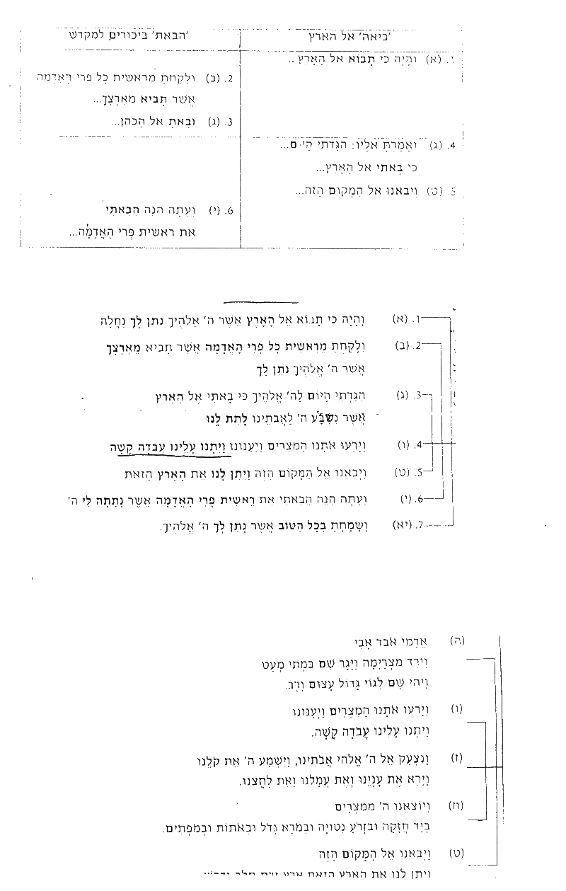 Сопоставляется описание прихода в землю и обсуждаемого текста. Сравнение обещаний и исполнений; место «египетского рабства». Смысл заповеди бикурим; дополнение к «шалош регалим».3. Взаимоотношение Всевышнего и народа