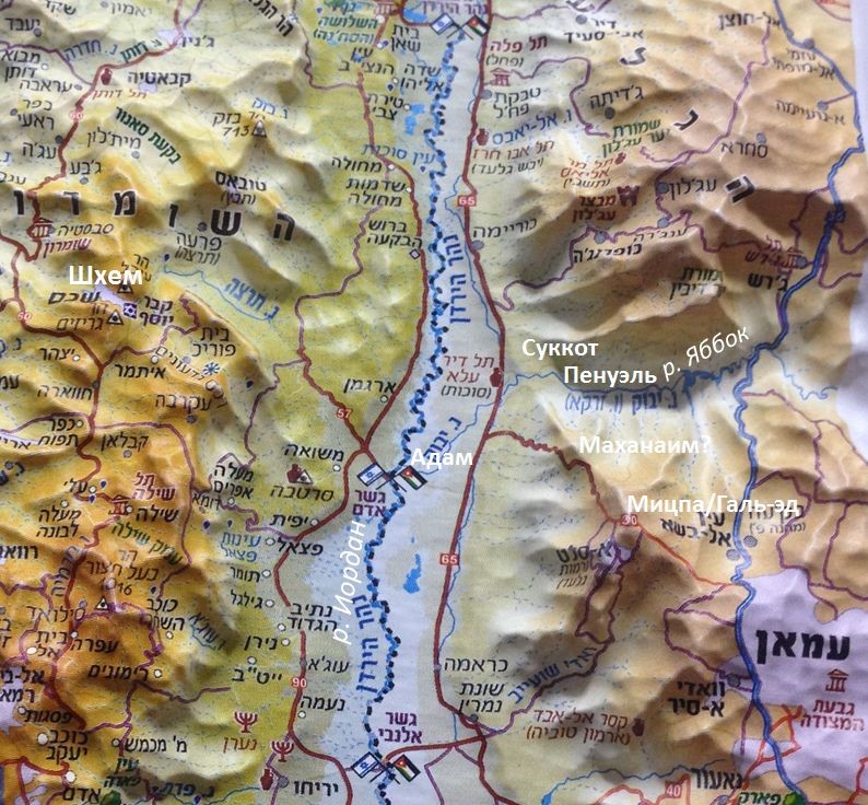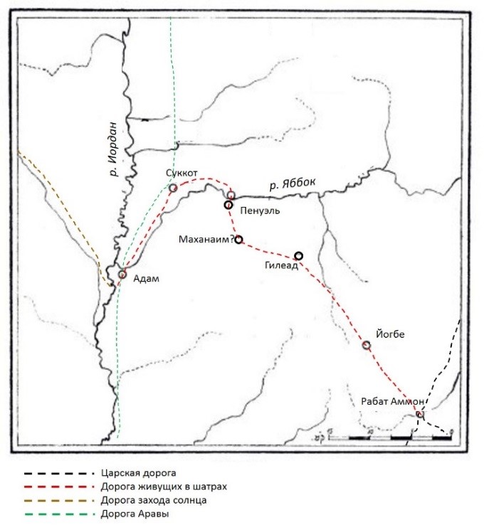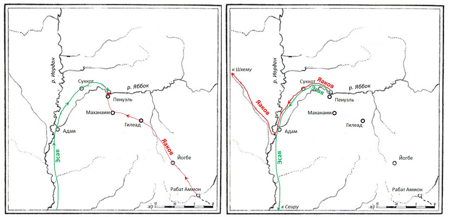 - Чтобы попасть в землю Ханаан из Заиорданья, Яакову нужно переправиться через реку Иордан. Путь с гор Гилеада до переправы через Иордан проходит по северному берегу реки Яббок, через Суккот. Если Яаков подходит к реке Яббок с севера, как на Рис. 1, то, чтобы попасть в Суккот, ему вообще не надо переправляться через реку Яббок!