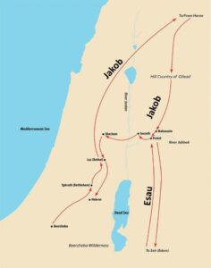 - Маршруты Яакова и Эсава на Рис. 1 не встречные, а перпендикулярные. Судя по этому рисунку, если бы Яаков поторопился, то он бы переправился через Иордан и пришел в Шхем, избежав встречи с Эсавом. Как при таком раскладе Яакову и Эсаву вообще удалось встретиться?