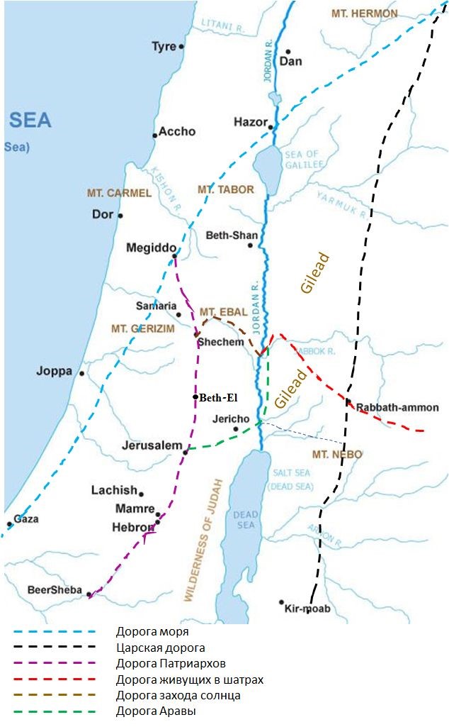 Рис. 2 показывает основные дороги в земле Ханаан и Заиорданье. Главная дорога Ханаана- это Дорога моря, Via Maris, которая идет из Дамаска в Египет и проходит по приморской низменности. Следующая по важности- это Царская дорога, которая идет из Дамаска и пересекает всё Заиорданье по горному хребту. Третья дорога, ведущая с севера на юг,- это Дорога Патриархов, которая пролегает по горному хребту в малонаселенной части Ханаана от Мегиддо до Беер Шевы, и именно по ней передвигались Авраам, Ицхак и Яаков. Из поперечных дорог, соединяющих эти три главные магистрали, важна Дорога живущих в шатрах, известная нам из истории Гидеона и Мидианитян. Она идет из Рабат-Аммона через Йогбе и далее до переправы через Иордан у г. Адам. Её продолжение на другом берегу Иордана- это Дорога заходящего солнца, идущая по долине Тирцы до Шхема. Во времена Иегошуа по ней народ Израиля поднялся к Шхему, чтобы заключить союз со Всевышним между горами Эйваль и Гризим. Кроме того, нам важна дорога Аравы. По ней бежал царь Цидкиягу из осажденного Иерусалима, по ней бежали убийцы Ишбошета из Маханаима в Хеврон, и по ней же, видимо, бежал Давид из Иерусалима в Маханаим, спасаясь от Авшалома.