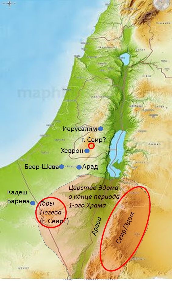 Но всё же, почему Тора ассоциирует Эсава с горой Сеир, где эта гора находится? Надо отметить, что Сеир — это не имя собственное, а означает дословно Волосатая гора, то есть гора, покрытая деревьями или кустарником. Гор с таким названием в Ханаане примерно столько же, сколько на Украине или в России мест под названием Лысая гора. Кроме общепринятого понимания горы Сеир как высокого плато, простирающегося к востоку от Аравы и от юга Моава до Эцион-Гевер (современные Акаба и Эйлат), из книга Иегошуа 15:10 мы узнаем, что есть другая гора Сеир на границе надела Иегуды, которая, видимо, соответствует современной арабской деревне Саир, находящейся к северо-востоку от Хеврона. Из многочисленных упоминаний горы Сеир в Танахе мы понимаем, что гора Сеир есть и к западу от Аравы, вблизи от Кадеш Барнеа[3] — похоже, что это горы Негева окаймляющие Махтеш Рамон. Я считаю, что гора Сеир, которая ассоциируется с Эсавом- это горы Негева. (Подробнее об этой идентификации в следующей статье).