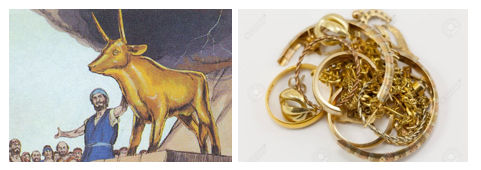 שמות 32:2 וַיֹּ֤אמֶר אֲלֵהֶם֙ אַֽהֲרֹ֔ן פָּֽרְקוּ֙ נִזְמֵ֣י הַזָּהָ֔ב אֲשֶׁר֙ בְּאָזְנֵ֣י נְשֵׁיכֶ֔ם בְּנֵיכֶ֖ם וּבְנֹֽתֵיכֶ֑ם וְהָבִ֖יאוּ אֵלָֽי:32:3 וַיִּתְפָּֽרְקוּ֙ כָּל־הָעָ֔ם אֶת־נִזְמֵ֥י הַזָּהָ֖ב אֲשֶׁ֣ר בְּאָזְנֵיהֶ֑ם וַיָּבִ֖יאוּ אֶל־אַֽהֲרֹֽן: 32:4וַיִּקַּ֣ח מִיָּדָ֗ם וַיָּ֤צַר אֹתוֹ֙ בַּחֶ֔רֶט וַיַּֽעֲשֵׂ֖הוּ עֵ֣גֶל מַסֵּכָ֑ה וַיֹּ֣אמְר֔וּ אֵ֤לֶּה אֱלֹהֶ֨יךָ֙ יִשְׂרָאֵ֔ל אֲשֶׁ֥ר הֶֽעֱל֖וּךָ מֵאֶ֥רֶץ מִצְרָֽיִם: