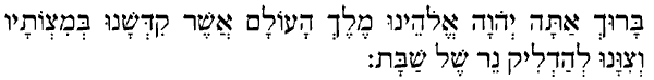 «Благословен Ты Г-сподь, Б-г наш, Владыка вселенной, освятивший нас Своими заповедями и повелевший нам зажигать субботние свечи!» (В общинах Хабада говорят: «...свечи святой Субботы!») |
