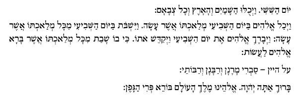 Йом ѓа-шиши. Ва-йехулу ѓа-шамайим ве- ѓаа-арец, ве-холь цваам. Ва-йехаль Элоѓим ба-йом ѓа-швии млахто, ашер аса; ва-йишбот ба-йом ѓа-швии ми-коль млахто, ашер аса. Ва-йеварех Элоѓим эт йом ѓа-швии, ва-йекадеш ото, ки во шават ми-коль млахто, ашер бара Элоѓим лаасот. Саври, маранан! Барух Ата, Адонай, Элоѓейну, Мелех ѓа-олам, борэ при ѓа-гафен! Барух Ата, Адонай, Элоѓейну, Мелех ѓа-олам, ашер кидшану бе-мицвотав, ве-раца вану, ве-Шабат кодшо бе-аѓава у-ве-рацон ѓинхилану зикарон ле-маасэ в-рейшит, - тхила ль-микраэй-кодеш, зехер ли-йцият-Мицрайим. Ки вану вахарта ве-отану кидашта ми-коль ѓа-амим, в-Шабат кодшеха бе- аѓава у-ве-рацон ѓинхальтану. Барух Ата, Адонай, мекадеш ѓа-Шабат! |