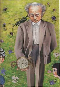 Вскоре они уселись на траву и принялись закусывать, а закончив трапезу, растянулись на траве отдохнуть. Кузнечик приблизился к ним и запел совсем тихонько, чтоб их не разбудить. С удивлением, глядя на фигурки, так не похожие на него, он подскакивал то к одним, то к другим, касался то руки, то ноги, то пряди волос, каждому улыбался, но все напрасно: его никто не замечал, даже те, кто не спали, а просто лежали с открытыми глазами, казалось, не обращали никакого внимания на Кузнечика и на его знаки внимания. Он очень обиделся. Приблизился к учителю в надежде, что тот его заметит. Но и тут судьба ему не улыбнулась: учитель даже не посмотрел в его сторону, хотя и не спал.