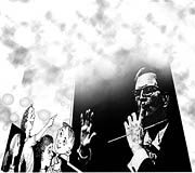 как одержимый и указывает на одного из музыкантов; делает ему знаки рукой,
