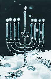 зажиганием свечей. У горящих огней восьмисвечника евреи празднуют Хануку,