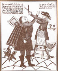 Русский лубок сохранил для нас драматический момент уничтожения бороды.