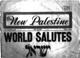 Впервые за девятнадцать столетий в Тель-Авиве родилось независимое еврейское государство, - когда британский мандат на Палестину кончился в пятницу утром, и оно было немедленно подвергнуто испытанию огнем. Провозглашение Мединат Исраэль (Государств Израиль) не остановило битвы за Иерусалим. При этом большая часть (нового) города попала в руки евреев. Через несколько часов в Палестину вторглись мусульманские армии с юга, востока и севера, а Тель-Авив подвергся бомбардировке с воздуха.