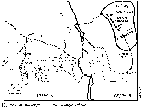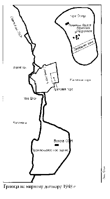 Линия прекращения огня проходящая с севера на юг разделила Иерусалим и закрепила статус-кво между вооруженными силами Израиля и иорданским арабским легионом существовавший с момента перемирия 1949 года. Старый город и некоторые районы на востоке находились под контролем Иордании а западная часть города под израильским управлением. Район в северo-восточной части города, который во время войны контролировался еврейскими вооруженными силами, теперь был окружен иорданской территорией и таким образом, оказался отрезанным от других районов, находящихся под управлением Израиля. Это был район горы Скопус где находился Еврейский университет, Национальная библиотека и больница Хадаса. Это была земля, купленная Национальным еврейским фондом (Керен Каемет ле Исраэль) специально для этих учреждений. С конца Войны за независимость и до июня 1967 года этот анклав был окружен иорданской территорией. Согласно пункту договора о перемирии Израиль имел право каждые две недели направлять туда полицейский конвой, чтобы осуществлять контроль над этим районом. Войска ООН проводили регулярную инспекцию линии прекращения огня. Евреи, жившие в западной части города, были отрезаны от самых для них священных мест от Западной стены и Храмовой горы. Согласно договору с Иорданией израильтяне должны были иметь доступ к этим местам, но Иордания проигнорировала этот пункт соглашения. До 1967 года евреи могли только смотреть на свои святые места, поднявшись на оставшуюся в их руках гору Сион.