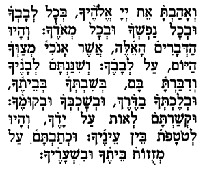 Ве-аhавта' эт Адона'й Элоhе'йха бе-хо'ль левавха,' у-ве-хо'ль нафшеха', у-ве-хо'ль меоде'ха. Ве-hаю' hа-двари'м hа-э'ле, аше'р Анохи' мецавха' hайо'м, аль леваве'ха. Ве-шинанта'м ле-ване'ха, ве-дибарта' бам, бе-шивтеха' бе-вейте'ха у-влехтеха' ва-де'рех у-в-шохбеха' у-в-куме'ха. У-кшарта'м ле-о'т аль яде'ха, ве-hаю' ле-тотафо'т бейн эйне'йха. У-хтавта'м аль мезузо'т бейте'ха у-ви-ш'аре'ха.
