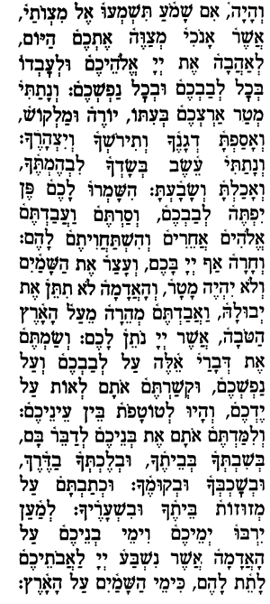 Ве-hая', им шамо'а тишмеу' эль мицвота'й, аше'р Анохи' мецаве' этхе'м hа-йо'м, ле-аhава' эт Адона'й Элоhейхе'м у-леовдо' бе-хо'ль левавхе'м у-ве-хо'ль нафшехе'м. Ве-натати' мета'р арцехе'м бе-ито', йорэ' у-малко'ш, ве-асафта' дгане'ха ве-тирошха' ве-йицhаре'ха. Ве-натати' э'сев бе-садха' ливhемте'ха, ве-ахальта' ве-сава'та. hишамру' лахе'м пен йифте' левавхе'м, ве-сарте'м ва-авадте'м элоhи'м ахери'м ве-hиштахавите'м лаhе'м. Ве-хара' аф Адона'й бахе'м, ве-аца'р эт hа-шама'им, ве-ло' йиhйе мата'р, ве-hа-адама' ло тите'н эт йевула', ва-авадте'м меhера' ме-а'ль hа-а'рец hа-това', аше'р Адона'й ноте'н лахе'м. Ве-самте'м эт двара'й э'ле аль левавхе'м ве-а'ль нафшехе'м, у-кшарте'м ота'м ле-о'т аль йедхе'м, ве-hаю' ле-тотафо'т бейн эйнейхе'м. Ве-лимадте'м ота'м эт бнейхе'м ледабе'р бам, бе-шивтеха' бе-вейте'ха у-в-лехтеха' ва-де'рех у-в-шохбеха' у-в-куме'ха. У-хтавта'м аль мезузо'т бейте'ха у-ви-ш'аре'ха. Лема'ан йирбу' йемейхе'м в-име'й внейхе'м аль hа-адама', аше'р нишба' Адона'й ла-авотейхе'м лате'т лаhе'м, к-име'й hа-шама'им аль hа-а'рец.