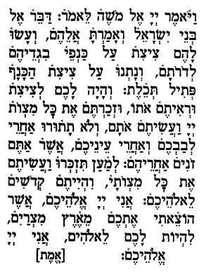 Ва-йо'мер Адона'й эль Моше' лемо'р: дабе'р эль бней Йисраэ'ль ве-амарта' алейhе'м, ве-асу' лаhе'м цици'т аль канфе'й вигдейhе'м ле-дорота'м, ве-натну' аль цици'т hа-кана'ф, пти'ль тхе'лет. Ве-hая' лахе'м ле-цици'т, у-ре'ите'м ото', у-зхарте'м эт коль мицво'т Адона'й, ва-асите'м ота'м, ве-ло' тату'ру ахаре'й левавхе'м ве-ахаре'й эйнейхе'м, аше'р ате'м зони'м ахарейhе'м. Лема'ан тизкеру' ва-асите'м эт коль мицвота'й, ви-hйите'м кедоши'м л-Элоhейхе'м. Ани' Адона'й Элоhейхе'м, Аше'р hоце'ти этхе'м ме-э'рец Мицра'им, лиhйот лахе'м л-Элоhи'м, Ани' Адона'й Элоhейхе'м. [Эме'т...]